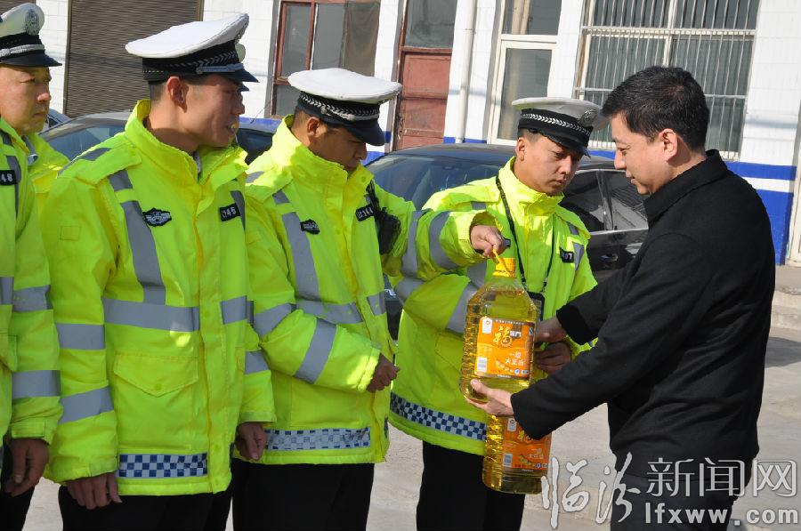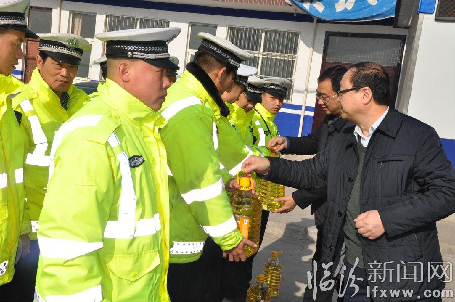 县委常委刘春林对广大公安交警恪尽职守、尽责履职、坚守工作岗位、舍小家为大家的过硬的纪律作风和优良的警容风貌给予肯定,并给大家送去了慰问品。