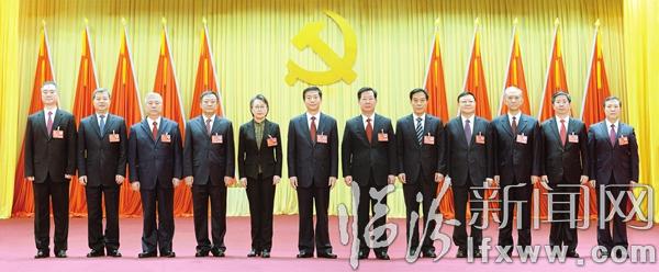 11月5日,中国共产党山西省第十一届委员会第一次全体会议在太原举行,全会选举产生了十一届省委常委和书记、副书记,骆惠宁(左六)当选为省委书记,楼阳生(右六)、黄晓薇(左五)当选为省委副书记,高建民(右五)、孙绍骋(左四)、王伟中(右四)、盛茂林(左三)、任建华(右三)、罗清宇(左二)、张吉福(右二)、王清宪(左一)、廉毅敏(右一)当选为省委常委。 山西日报记者 李联军 摄