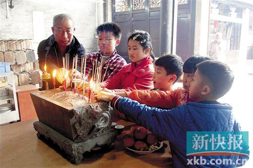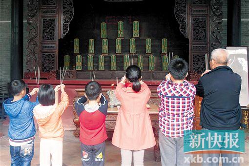 ■番禺区大龙村里的儿童在老人的带领下给祖先上香。