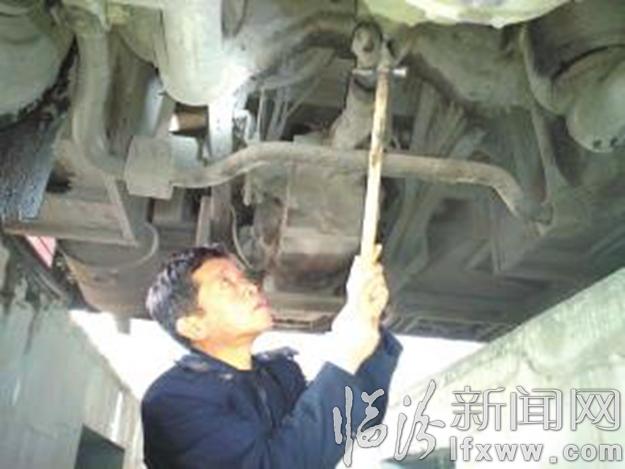 车辆刚驶入车辆检验室的安全例检场所,孟亚文已开始了车辆外观的检查工作。只见他进入一米多深的地沟内,逐个检查着车辆轮胎、传动轴支架等部件,还时不时地敲打着螺丝。