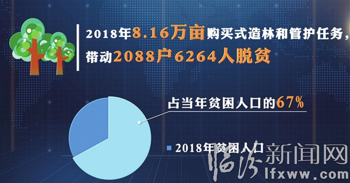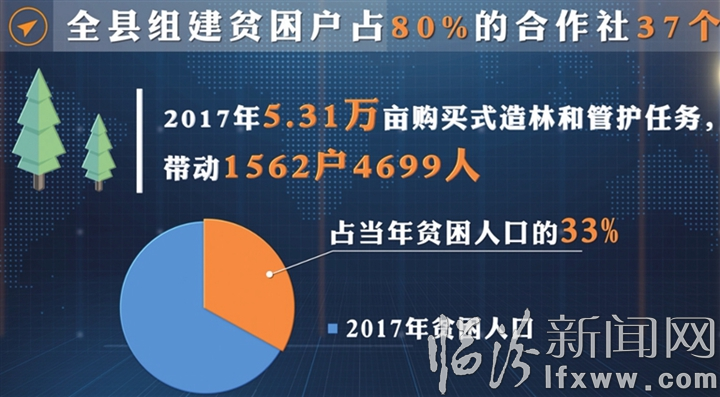 购买式造林为生态建设与脱贫攻坚架起了桥梁和纽带。把造林者的切身利益和造林成效的好坏直接挂钩,强化了造林者造活、护好的责任,确保了造林成活和贫困户收益,打开了生态扶贫+精准扶贫的通道,实现了生态建设和脱贫攻坚的有机结合。截至目前,该县组建贫困户占80%的造林合作社37个,2017年全县完成5.31万亩造林和管护任务,带动1562户4699人脱贫,占当年贫困人口的33%;2018年完成8.16万亩造林和管护任务,带动2088户6264人脱贫,占当年贫困人口的67%。