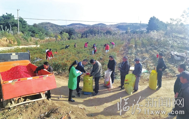 10月22日,记者来到该村的辣椒基地,放眼望去,那红彤彤的小辣椒在太阳的照射下格外耀眼。此时,农民们有的在采摘辣椒,有的现场进行过秤出售,有的把装好的辣椒往收购车上运……一派丰收、繁忙的景象。