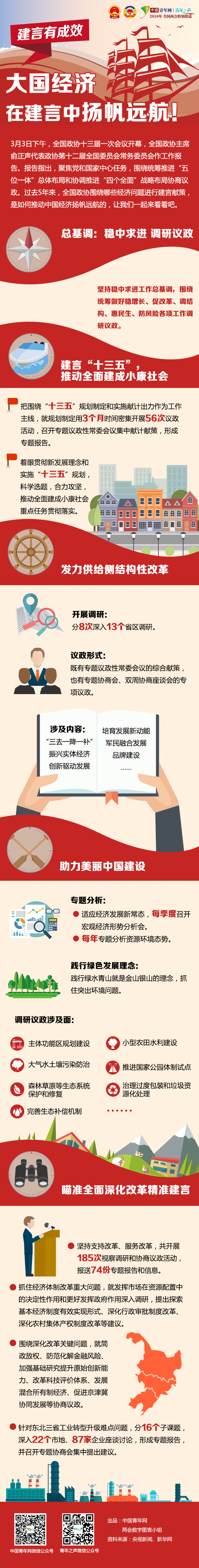 中国青年网北京3月4日电 3月3日下午,全国政协十三届一次会议开幕,全国政协主席俞正声代表政协第十二届全国委员会常务委员会作工作报告。报告指出,聚焦党和国家中心任务,围绕统筹推进“五位一体”总体布局和协调推进“四个全面”战略布局协商议政。过去5年来,全国政协围绕哪些经济问题进行建言献策,是如何推动中国经济扬帆远航的,让我们一起来看看吧。