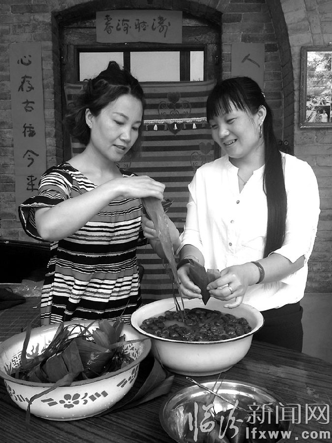 图为6月13日,霍州市辛置镇宋庄村两位村民正在包粽子。