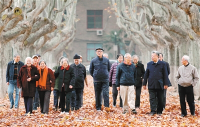 经历20世纪50年代交大西迁的部分师生行走在西安交大校园内(2015年11月19日摄)