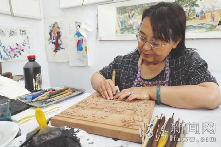 在临汾市非遗《太平丁家版画》传承人丁丽敏的工作室里,她正在给游客制作木版画。