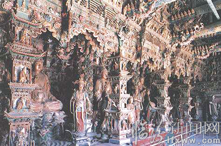 小西天以明代彩色悬塑艺术而闻名,其精华保存于大雄宝殿。殿内彩塑满布,除佛坛上的五尊主佛外,墙壁、檩柱、屋椽上塑有数以千计的彩塑。