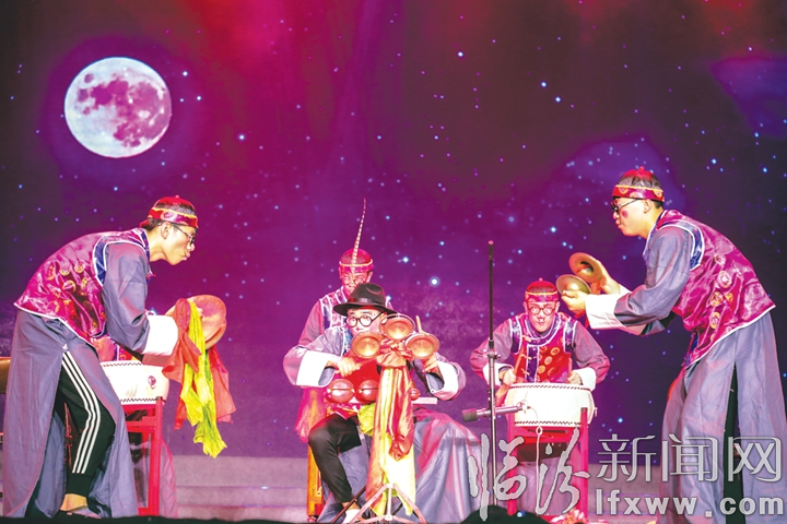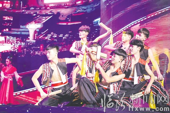 悠长的岁月蕴育了临汾深邃的地域文明,繁衍着光华璀璨的非遗文化,让人铭心刻骨。只听,喜庆的音乐和充满节奏感的木板击打声响彻舞台。只见,多层次的屏幕立体呈现喜悦的丰收美景。一群身着鲜艳农家服装的年轻男女欢快地冲上舞台中央,他们手持檀木板,在身体各个部位上下飞舞,尽情抒发对美好生活的赞美。