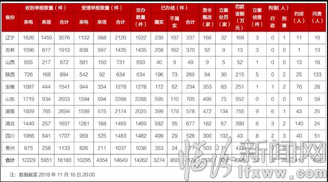 截至11月16日晚20:00,五个中央生态环境保护督察组共收到群众举报18180件,受理有效举报14649件,经梳理合并重复举报,累计向被督察地区交办转办14262件;各被督察地区已完成查处4124件,其中立案处罚608家,罚款3325万元;立案侦查42件,拘留32人;约谈416人,问责404人。但从具体数据看,辽宁、吉林、湖南等省份群众举报经查处后不属实比例较高,应引起重视。