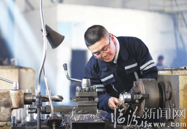 图为闫亚鹏在机修车间加工设备配件。 李青荣 摄