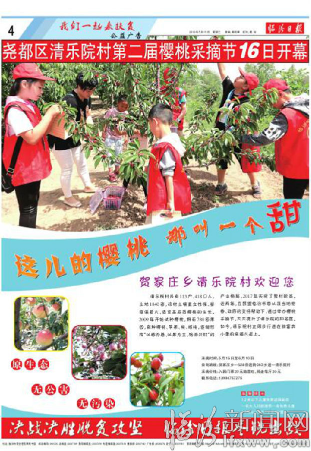 清乐院村共有113户、418口人,土地1840亩,该村土壤直立性强、昼夜温差大,适宜高品质樱桃的生长。2009年开始试种樱桃,拥有780亩果园,栽种樱桃、苹果、桃、核桃,逐渐形成“以粮为基、以果为主、旅游兴村”的产业格局,2017年实现了整村脱贫。近两年,在民盟临汾市委以及当地党委、政府的支持帮助下,通过举办樱桃采摘节,大大提升了清乐院的知名度。如今,清乐院村正阔步行进在致富奔小康的幸福大道上。