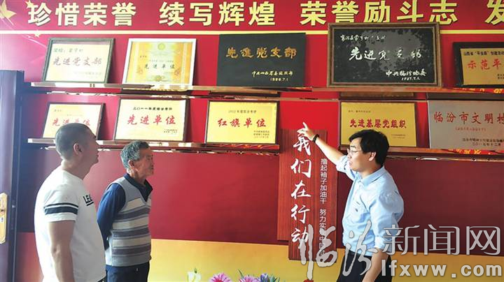“行,待会就去。”旁边的村民纷纷响应,蹲在一旁的老支书露出了满意的笑容。跟随王斌的脚步,记者与村民、老支书走进新改造的党群服务中心。在会议室墙面上,让人眼前一亮的是“珍惜荣誉,续写辉煌”一行大字下摆放着两排荣誉奖牌,最中间的是1986年省委组织部颁发的“先进党支部”奖牌。