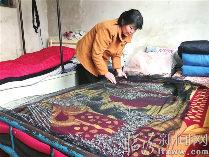 临汾新闻网讯 费时近一周,在一块一米多长的纱上,用手工缝制的珠饰(简称缝珠)大放异彩跃入眼帘。对于刘秀梅而言,这意味着马上又有一笔钱进账了。