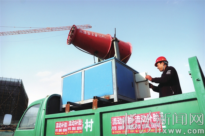 在霍州市全民健身中心建设工地,为有效抑制扬尘,施工方改装设计了可移动的雾炮车。