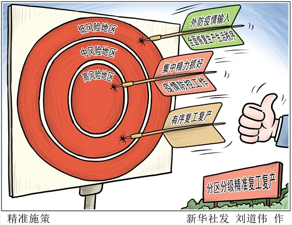 低风险地区要尽快将防控策略调整到外防输入上来,全面恢复生产生活秩序,中风险地区要依据防控形势有序复工复产,高风险地区要继续集中精力抓好疫情防控工作。中央对下一步复工复产作出的部署,传递出精准施策的重要信号。