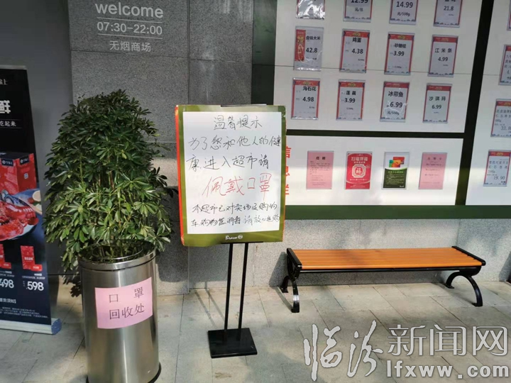 1月28日,在市区永辉超市临汾悦汇广场店,超市入口的“温馨提示”格外醒目:“为了您和他人的健康,进入超市请戴口罩。本超市已对卖场及购物车、购物筐消毒,请放心选购。”在提示牌旁边,放置着专门回收废弃口罩的垃圾桶。