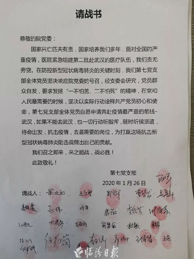 “全体党员申请奔赴疫情最严重的前线,如果不能去武汉,随时听候调遣,去最需要的岗位,我们招之即来,来之能战,战必胜!”第七党支部请战书上26个鲜红的手印跃然纸上,他们将分批去往武汉。