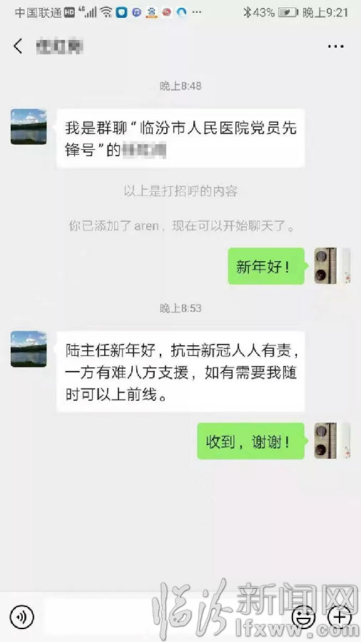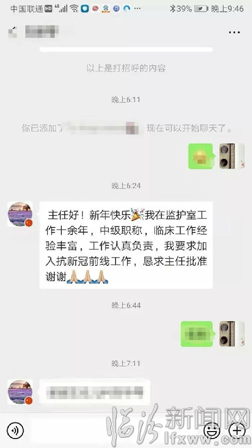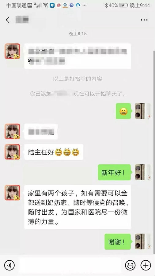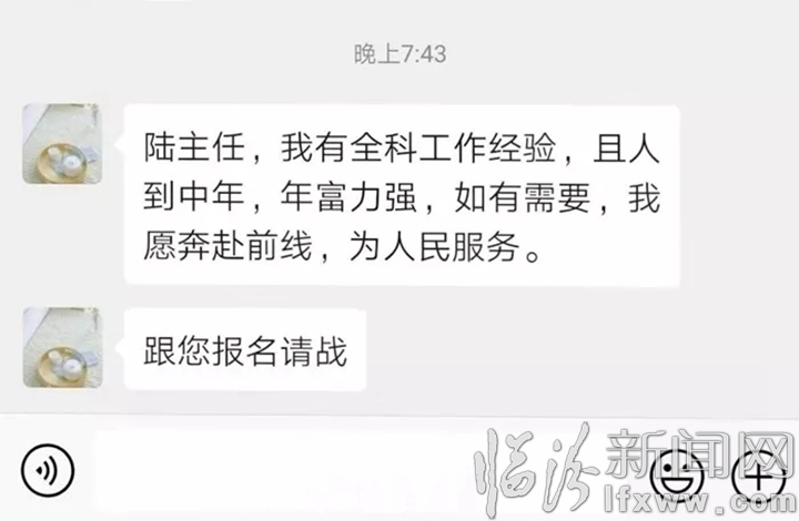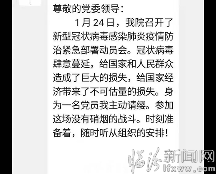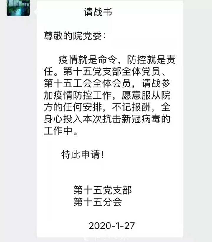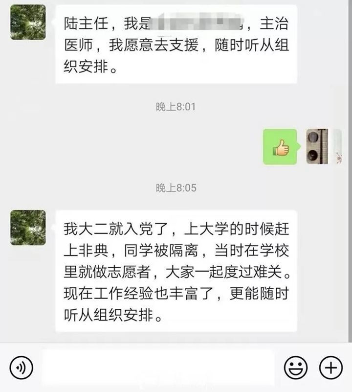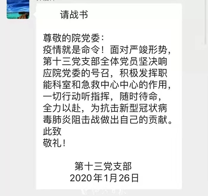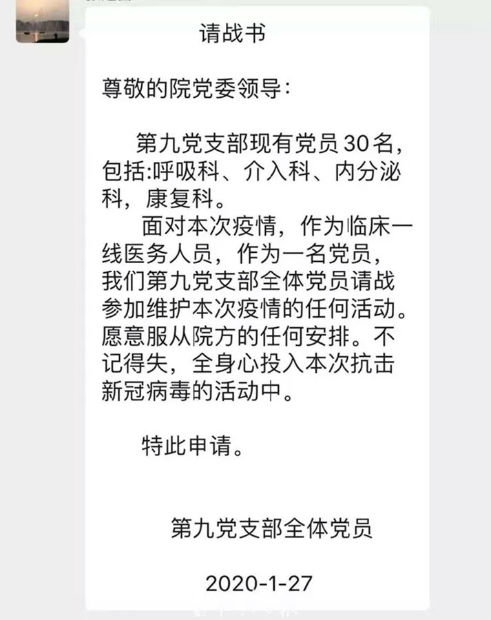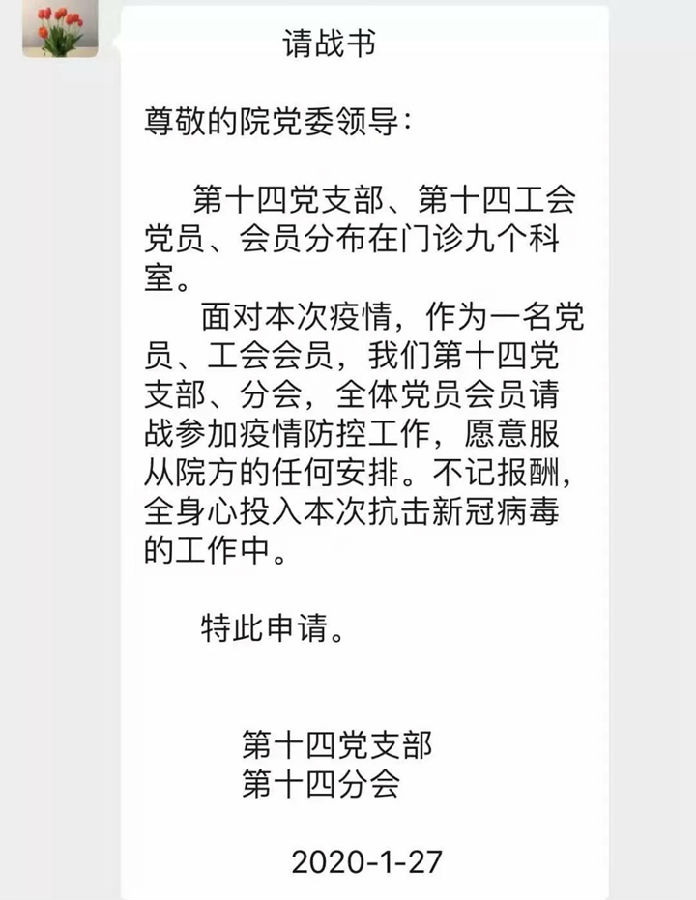 “家里有两个孩子,可以全送到奶奶家,随时等候党的召唤,随时出发,为国家和医院尽一份微薄的力量。”该医院党员先锋号的一名同志在微信上向院领导请战!