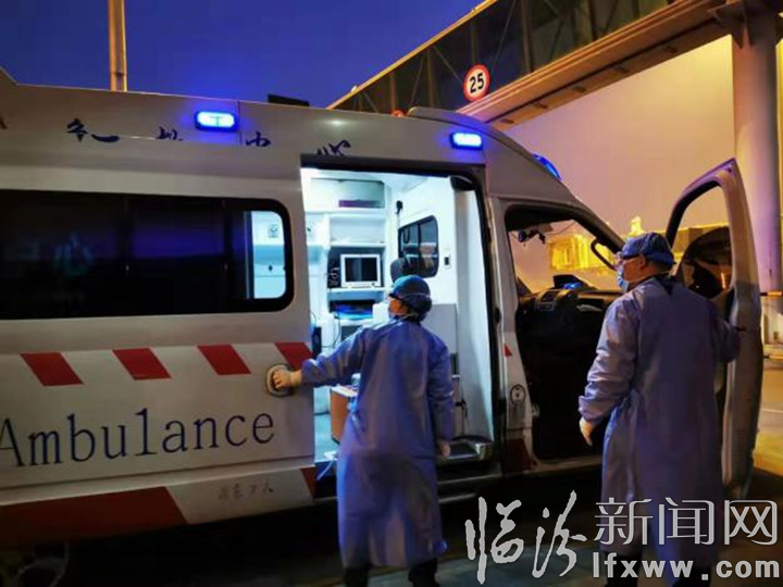 夜晚,120救护车从机场转运发热旅客,有待发热门诊进一步排查。