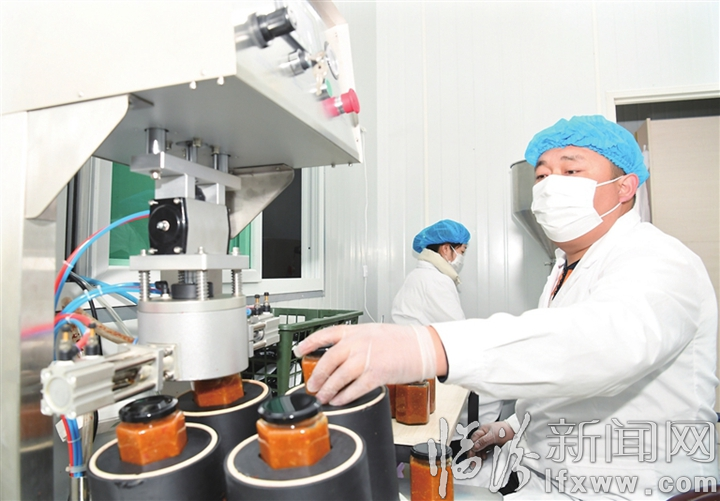 临汾新闻网讯 连日来,吉县桑峨谷泉农副产品销售有限公司在严格落实各项疫情防控措施的前提下,开足马力、全力生产。图为工人正在为石碾辣椒酱装罐。