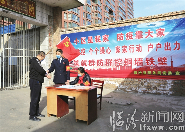 临汾新闻网讯 疫情防控期间,国家税务总局襄汾县税务局税务干部下沉社区开展疫情防控工作。图为该局税务干部正在为居民检测体温。(梁凯)