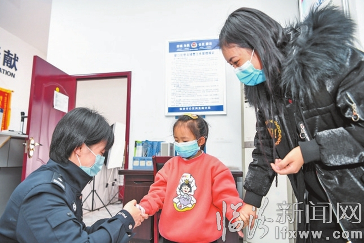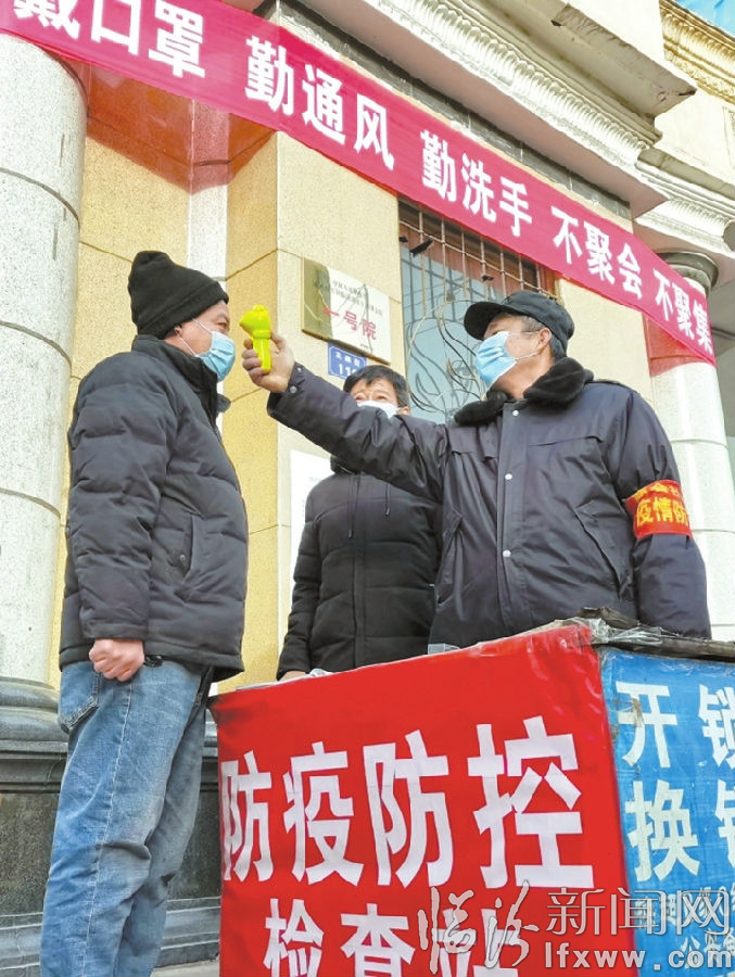 市公安局直属分局南街派出所工作人员为前来办事的群众检测体温。