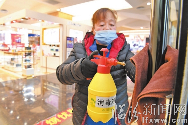 生龙国际·百悦名店工作人员对门把手消毒。