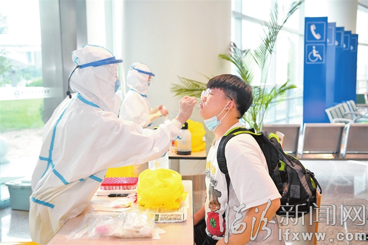 临汾新闻网讯 8月11日,在临汾尧都机场航站楼,医护人员在为抵达旅客做核酸检测。临汾尧都机场严格防控措施,在必须戴口罩、测体温、查验健康码常态化防控的同时,对所有抵达旅客实施核酸检测。