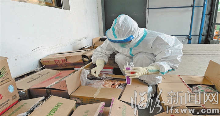临汾新闻网讯 随着春节临近,市市场监管局临汾经济开发区分局、市疾控中心着眼节日消费热点,定期深入农贸市场、商场超市、餐饮单位等地,持续开展冷链食品及储存环境、相关人员新冠病毒核酸采样抽检,坚持做到关口前移、“人物同防”,坚决阻断新冠病毒通过冷链食品渠道传播风险。图为市疾控中心采样组工作人员对冷链食品进行核酸采样。本报记者 摄