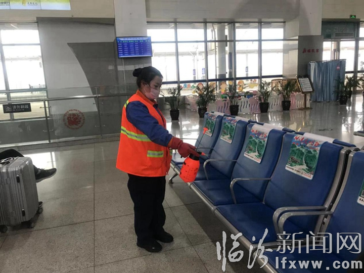 与往日不同的是,临汾西站候车厅的乘客数量有所减少,保洁人员每隔一个小时会对站内的栏杆、闸机、电梯扶手、水龙头开关等相关设施进行清理消毒,当班工作人员在交接班时还要进行测量体温,配戴口罩和一次性手套等防护用品。