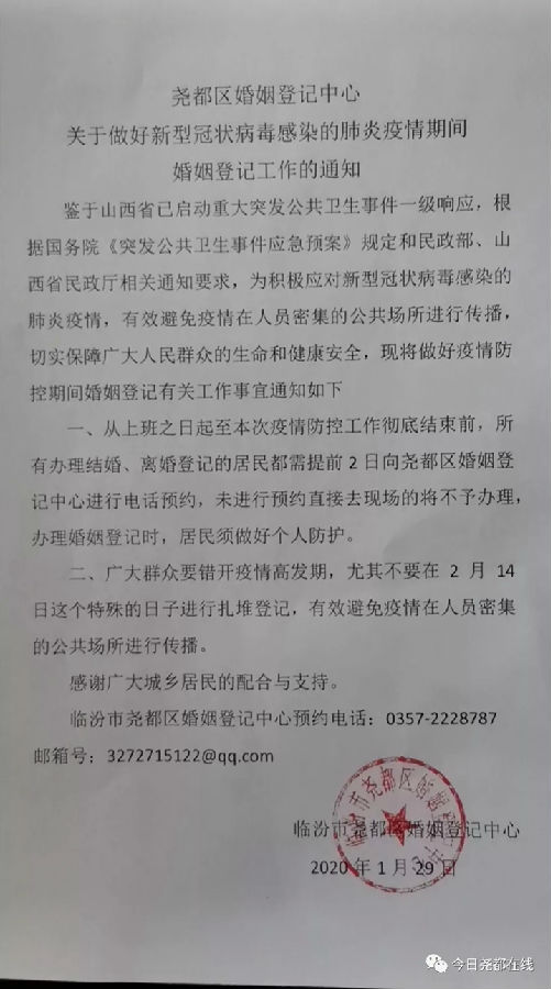 一、从上班之日起至本次疫情防控工作彻底结束前,所有办理结婚、离婚登记的居民都需提前2日向尧都区婚姻登记中心进行电话预约,未进行预约直接去现场的将不予办理,办理婚姻登记时,居民须做好个人防护。