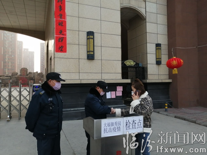 这是1月29日记者在尧都区大福御秀园小区门口看到的一幕。在一番详细询问和体温检测后,该女士才进入了小区。
