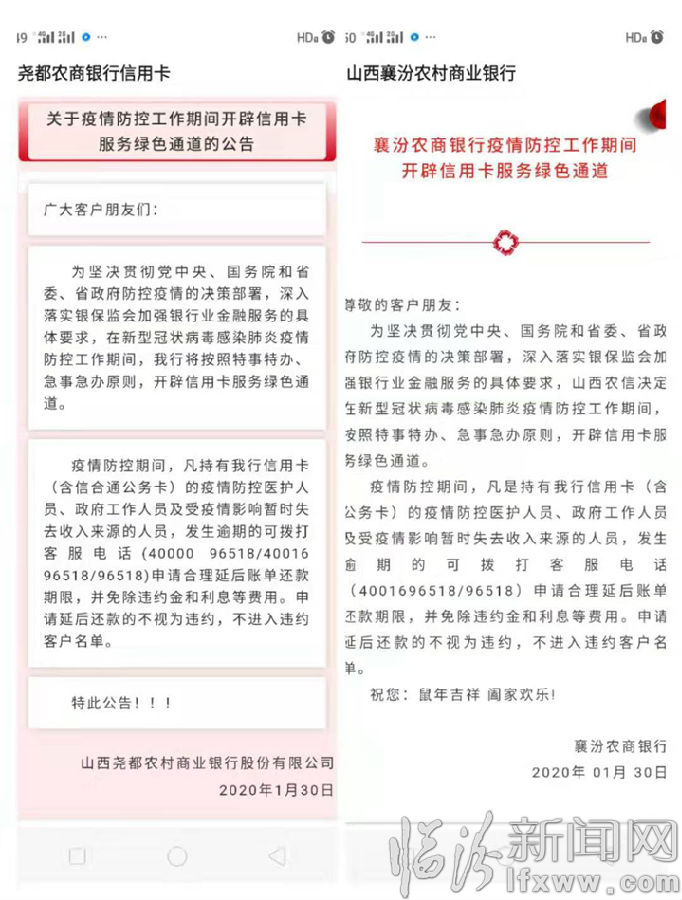 尧都农商银行、襄汾农商银行、乡宁农商银行、曲沃农商银行等发卡机构按照特事特办、急事急办原则,开辟信用卡服务绿色通道。疫情防控期间,持有农信信用卡的医护人员、政府人员及受疫情影响暂时失去收入来源的人员,发生逾期的可拨打客服电话(4001696518/96518)申请合理延后账单还款期限,并免除违约金和利息等费用,申请延后还款的不视为违约,不进入违约客户名单。