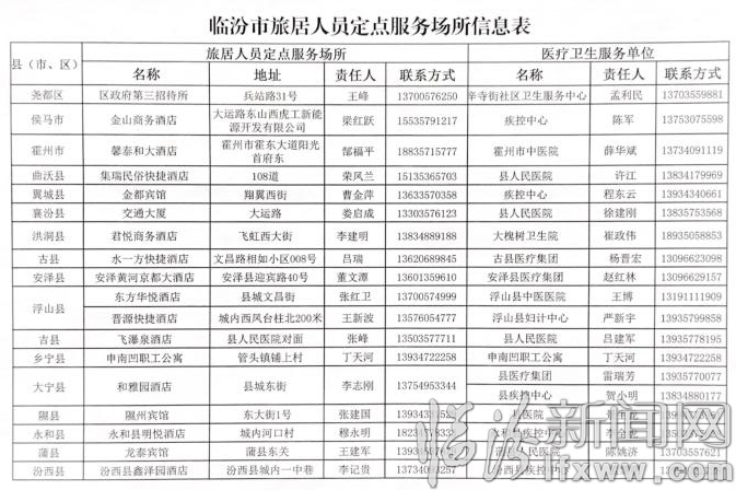 为进一步做好我市新型冠状病毒感染的肺炎疫情防控工作,我市以县(市、区)为单位设立了17个定点服务场所,专门为湖北籍在临汾旅居人员特别是不具备居家观察条件的提供定点服务,其他外来人员(包括企业复工以后的外来务工人员)需要居家观察,不具备相关条件的,也由以上定点场所提供服务。现将各县(市、区)设立的定点服务场所相关信息公告如下: