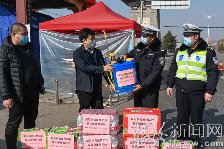 临汾新闻网讯 2月13日,在曲沃县和襄汾县疫情防控监控点,人保财险曲沃支公司为一线的执勤人员送去了防疫物资,感谢他们为疫情防控做出的辛勤努力。此次捐赠的物资有84消毒液、喷雾器和食品等。