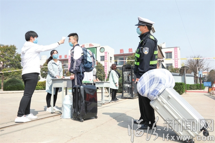 8时许,胡越彦到达学校。从下车那一刻起,她的心里满满都是感动。学校设置了绿色通道,有志愿者、老师、交警等帮助他们搬行李。在检测点,胡越彦把头往仪器上一凑,两秒后温度便显示在电子屏上。她的行李很重,校内的爱心志愿车帮她运至宿舍。