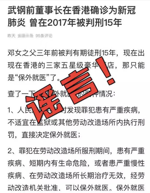 谣言二:武钢前董事长保外就医在港染新冠肺炎