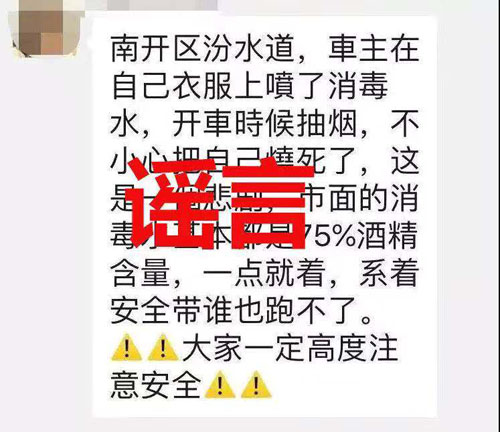 谣言八:网传男子喷酒精消毒后开车抽烟引发燃烧