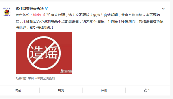 “钟南山来新疆了”是一则谣言。刚刚,“@喀什网警巡查执法”辟谣:钟南山并没有来新疆,请大家不要放大疫情。请大家不要转发非官方信息,不信谣、不传谣!