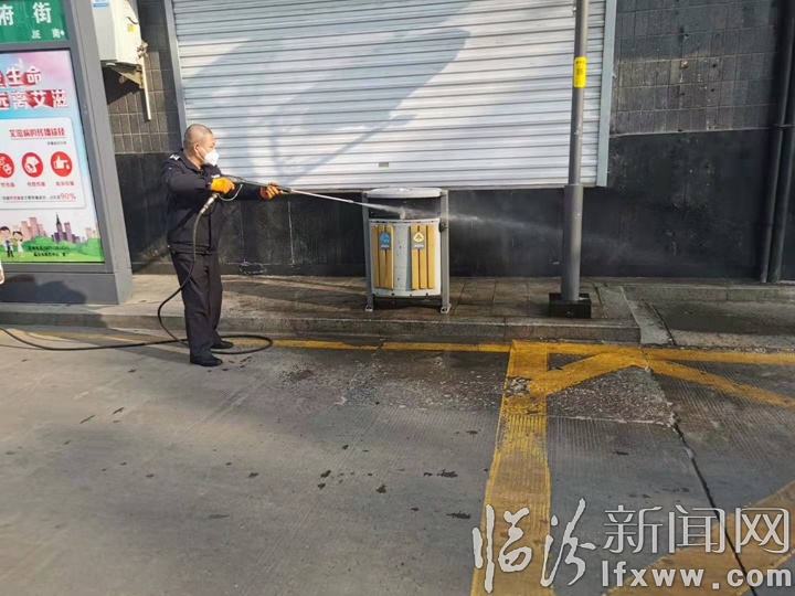 下午三点,市区解放西路行署巷,西城环卫所值班人员李维斌拿着冲洗水枪对着垃圾箱进行消毒,十几秒的工夫,一个垃圾箱就完成了消毒。