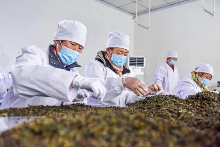 工人加工生产连翘茶