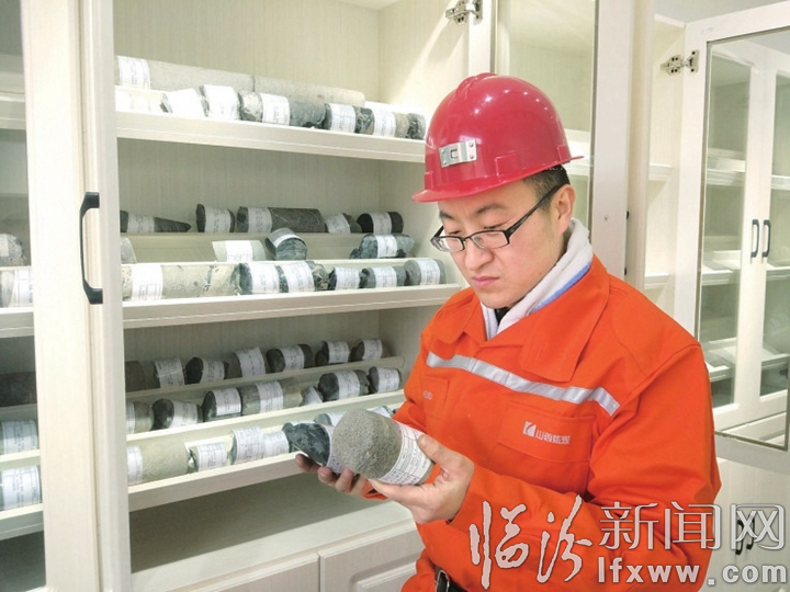 图为周鹏在观察从矿井深处采集的岩层样本。