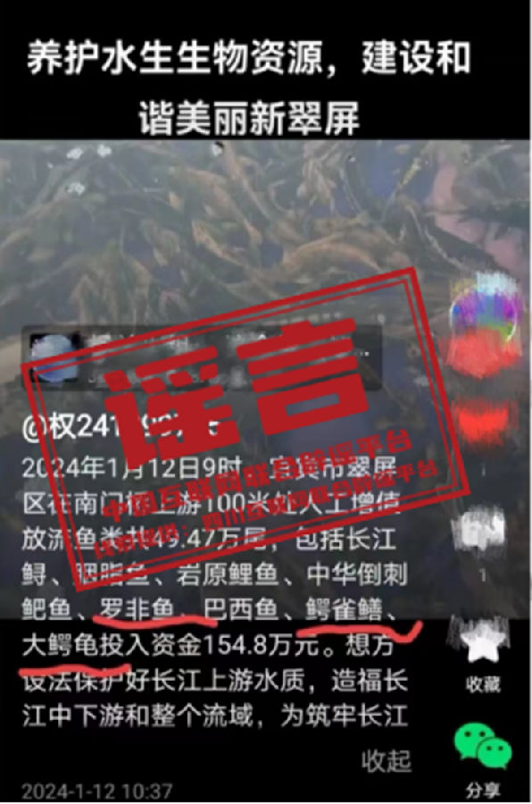 真相:近日,有网民在网络平台发布信息称,四川宜宾出现往长江里投放鳄雀鳝的情况。经媒体采访核实,上述传言为虚假信息。宜宾市翠屏区农业农村局水产渔业站站长刘晓欢表示,该信息发布的图片截图和视频内容实为1月12日翠屏区人工增殖放流活动的画面,此次活动中投放的鱼类并没有网传的鳄雀鳝、罗非鱼、大鳄龟等水生外来入侵物种。活动中投放的鱼类为长江鲟等濒危物种,通过放流成体、亚成体、苗种等不同种群,可以为种群恢复和自然繁殖起到良好促进作用。(来源:四川互联网联合辟谣平台、封面新闻)