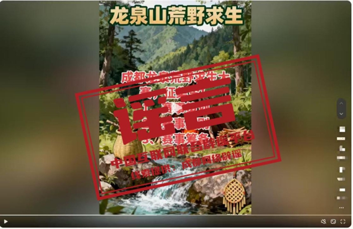真相:近日,有网民在社交平台发布“成都龙泉荒野求生大赛征集令”,称龙泉山将举办荒野求生赛事,并面向社会征集赛事策划、规则和筹备方案。相关帖文引发关注,不少网友表达参赛意愿,询问报名方式、发起组队邀约等。11月7日,成都龙泉山城市森林公园管委会发布官方通告称,经核实,官方无组织举办此活动的计划安排,也未收到任何组织和个人申报举办该活动的报备,请广大网民对有关信息注意甄别,谨防上当受骗。(来源:“成都网络辟谣”微信公众号)