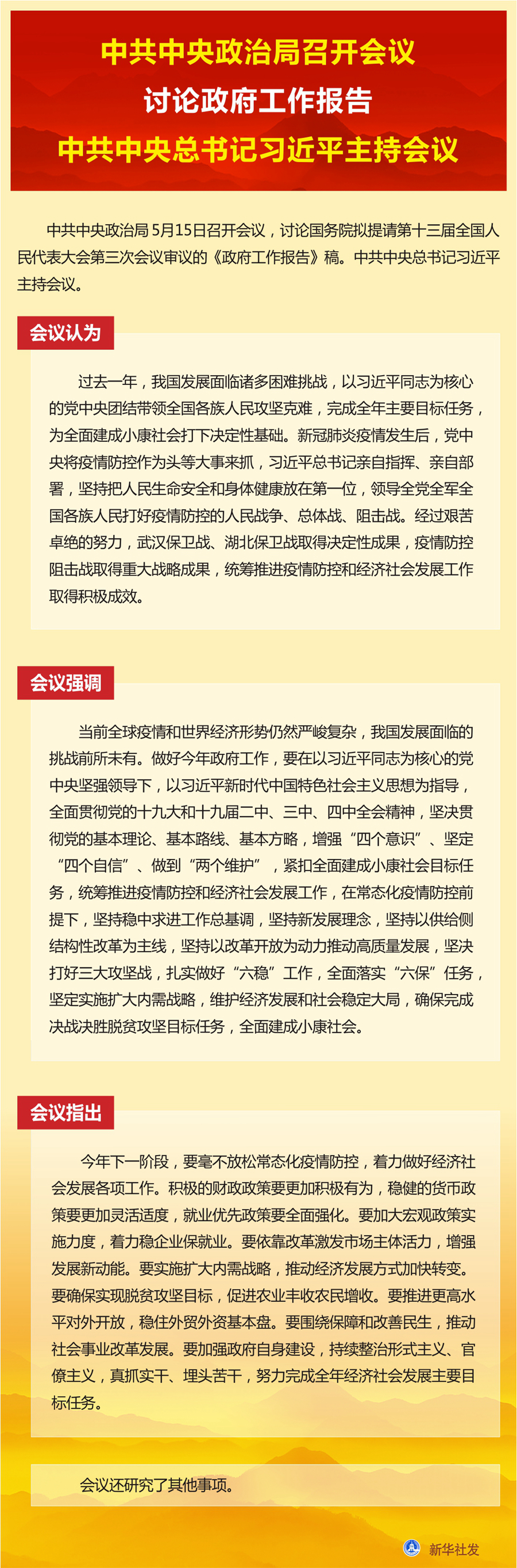 新华社北京5月15日电 中共中央政治局5月15日召开会议,讨论国务院拟提请第十三届全国人民代表大会第三次会议审议的《政府工作报告》稿。中共中央总书记习近平主持会议。