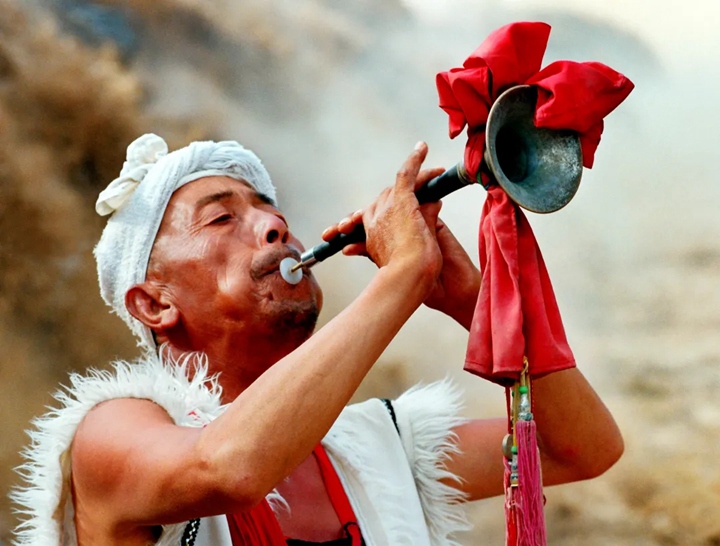 ▲吕桂明用胶片机拍摄的壶口瀑布边吹唢呐的人