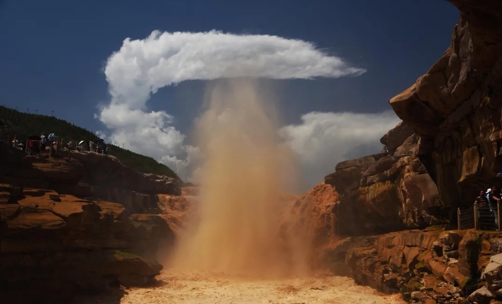 壶口瀑布位于山西吉县和陕西宜川之间,黄河流经晋陕峡谷到达吉县境内,水面由三四百米宽骤然收缩为50多米,跌入落差30多米深的石槽中,形若巨壶注水,故名壶口瀑布。