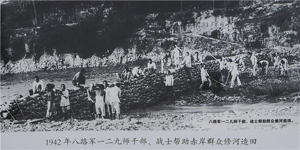 1942年八路军一二九师干部、战士帮助赤岸群众修河造田。图片由邯郸日报社提供