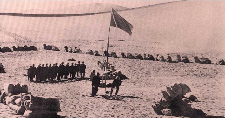 1958年国庆节,横穿塔克拉玛干沙漠的石油地质队在沙漠举行升国旗仪式。图片由克拉玛依日报社提供。