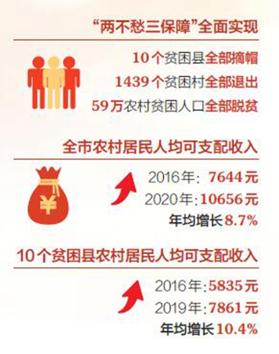 ——群众收入大幅提高,全市农村居民人均可支配收入由2016年的7644元增长到2020年的10656元,年均增长8.7%;10个贫困县农村居民人均可支配收入从2016年的5835元增长到2019年的7861元,年均增长10.4%。